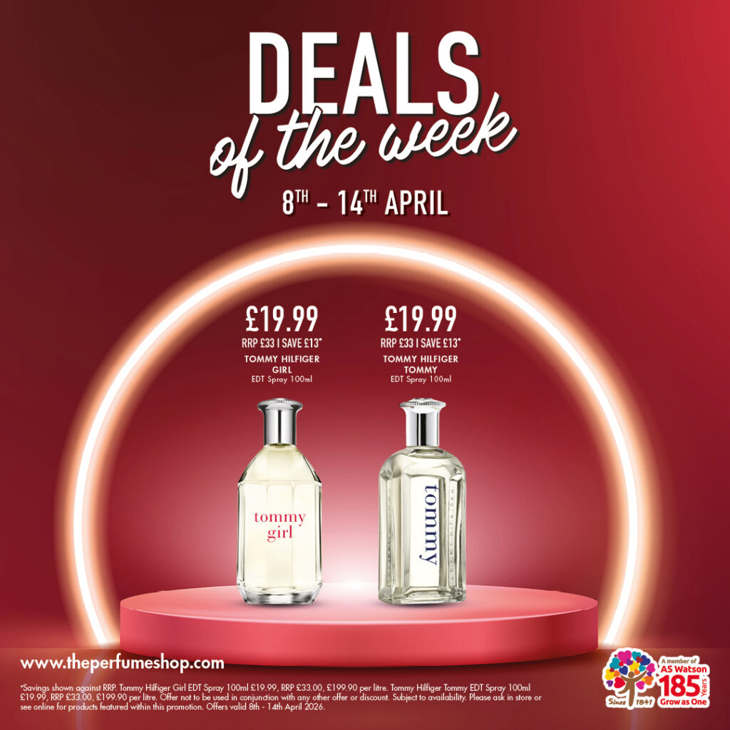 *Savings shown against RRP. Tommy Hilfiger Girl EDT Spray 100ml £19.99, RRP £33.00, £199.90 per litre. Tommy Hilfiger Tommy EDT Spray 100ml £19.99, RRP £33.00, £99.90 per litre. Offer not to be used in conjunction with any other offer or discount. Subject to availability. Please ask in store or see online for products featured within this promotion. Offers valid 8th – 14th April 2026.