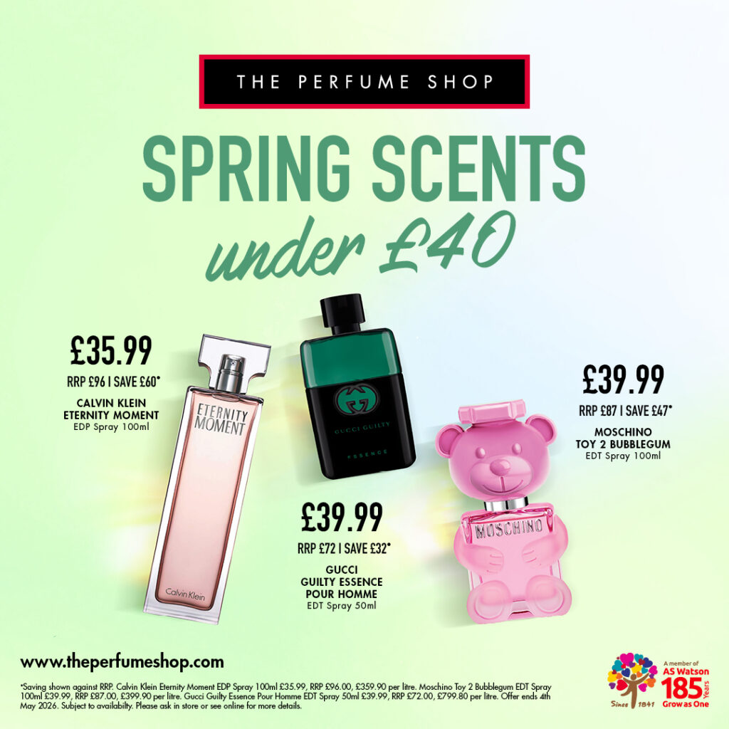 Saving shown against RRP. Calvin Klein Eternity Moment EDP Spray 100ml £35.99, RRP £96.00. Moschino Toy 2 Bubblegum EDT Spray 100ml £39.99, RRP £87.00. Gucci Guilty Essence Pour Homme EDT Spray 50ml £39.99, RRP £72.00. Offer ends 4th May 2026. Subject to availability. Please ask in store or see online for more details.