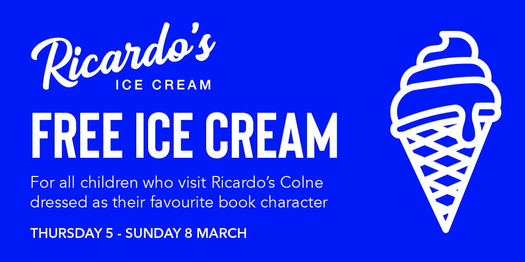 All children who visit Ricardo’s at Colne dressed as their favourite book character will receive a Free Ice Cream! Offer valid 05/03/26 – 08/03/26. View full terms here.