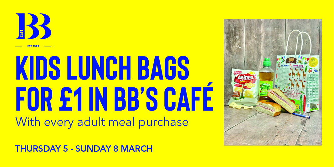 Children can enjoy a lunch bag in BB’s Café at Colne, Walsall & Newcastle for £1 with every adult meal purchased. Offer valid 05/03/26 – 08/03/26.